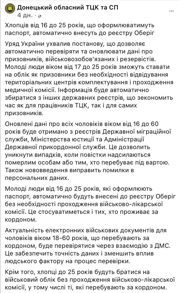 Також "молоді люди від 16 до 25 років, які оформлюють паспорт, автоматично будуть внесені до реєстру Оберіг без необхідності проходження військово-лікарської комісії". Це стосується і тих, хто мешкає за кордоном.