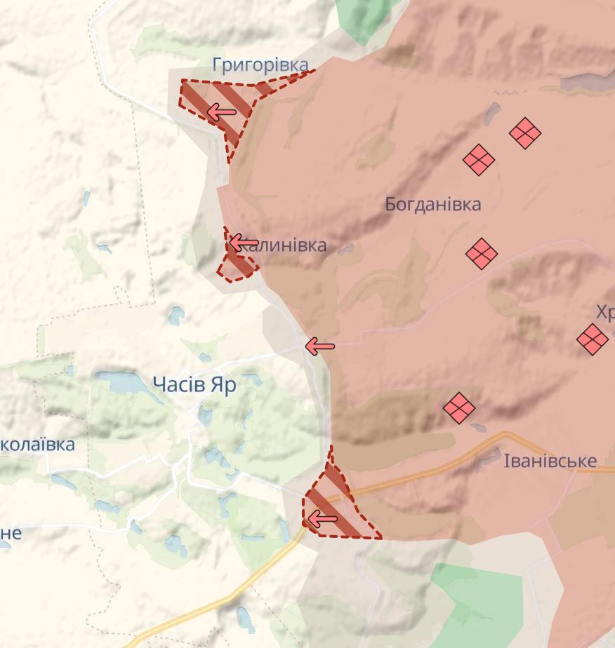 На Донбасі російські війська просунулися у трьох місцях під Часовим Яром, повідомляє DeepState. Просування було на південь від міста, де РФ захопила роздоріжжя доріг, яка веде до Годин Яру з Бахмута та Костянтинівки. А також на північ - в районах Калинівки та Григорівки.