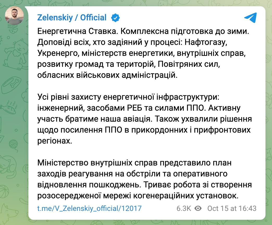 "Прийнято рішення про посилення ППО у прикордонних та прифронтових регіонах. Продовжується робота зі створення розосередженої мережі когенераційних установок", - повідомляє президент.