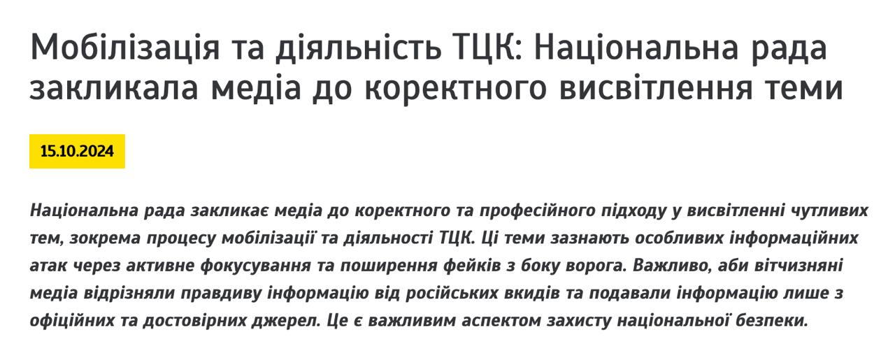 12:59 Нацрада з ТБ та радіо закликає медіа "коректно" висвітлювати тему мобілізації та роботи ТЦК.