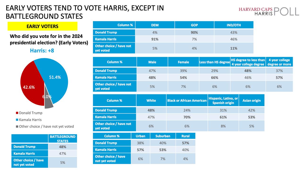 Харріс поки випереджає Трампа на 8% серед тих, хто достроково проголосував по всіх штатах - 51% проти 43%.