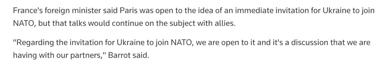 Також Барро додав, що Франція "відкрита для ідеї" запрошення України до НАТО, але продовжуватиме переговори із союзниками з цього питання.