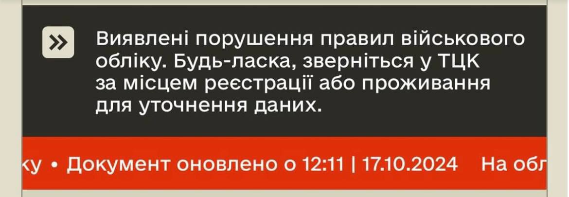Військовозобов'язані, які оновили свої персональні дані до 17 липня, почали отримувати у додатку "Резерв+" повідомлення про те, що їм необхідно з'явитися до ТЦК, оскільки було виявлено порушення правил військового обліку.