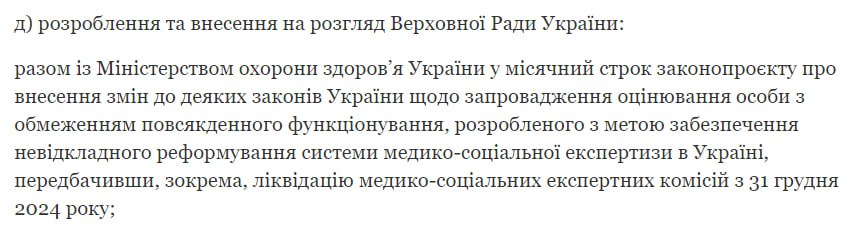"Разом із Міністерством охорони здоров'я України у місячний строк законопроекту про внесення змін до деяких законів України щодо запровадження оцінки особи з обмеженням повсякденного функціонування, розробленої з метою забезпечення невідкладного реформування системи медико-соціальної експертизи в Україні, передбачивши, зокрема, ліквідацію медико-соціальних експертних комісій з 31 грудня 2024 року”, – дослівно йдеться у рішенні РНБО.