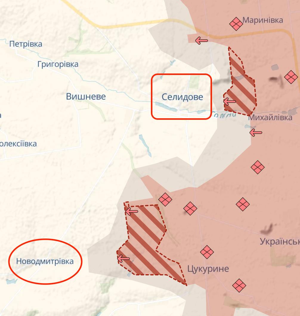 Інший військовий пише, що росіяни захопили східну частину Селідово, на півдні вони наступають без особливих успіхів, ЗСУ проводять контратаки. На півночі росіяни намагаються перекрити основну дорогу із Покровська. На півдні бої вже тривають на околиці Нововодмитрівки.