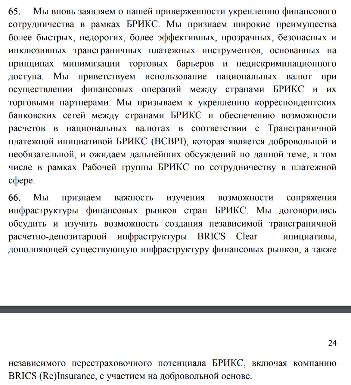 "Ми визнаємо важливість вивчення можливості поєднання інфраструктури фінансових ринків країн БРІКС. Ми домовилися обговорити та вивчити можливість створення незалежної транскордонної розрахунково-депозитарної інфраструктури BRICS Clear – ініціативи, що доповнює існуючу інфраструктуру фінансових ринків, а також незалежного перестрахувального потенціалу БРІКС, включаючи компанію BR Insurance, за участю на добровільній основі", - йдеться у декларації.