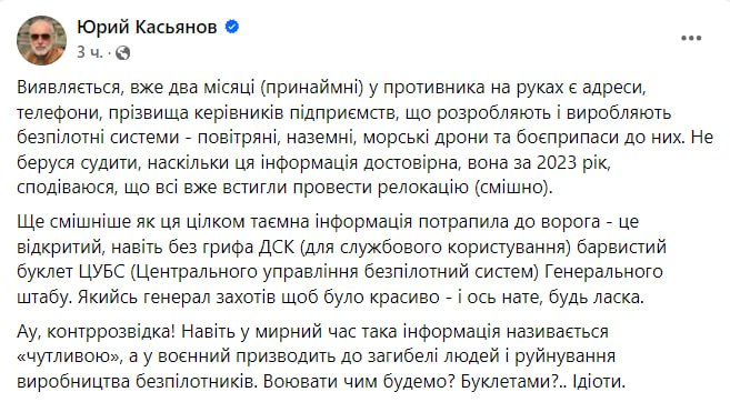 "Ця таємна інформація потрапила до ворога з відкритого, навіть без грифу ДСП (для службового користування) барвистого буклету Центрального управління безпілотних систем Генерального штабу", – розповів Касьянов.