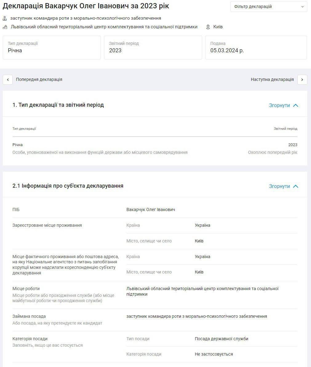 Причину та мотиви звільнення не названо. За 2023 рік Олег Вакарчук заробив 432 тис. грн у ТЦК та ще 100 тис. грн у компанії ТОВ "ДОК ПРОМ", в якій він має корпоративні права. Ця фірма зареєстрована у Київській області та займається оптовою торгівлею.
