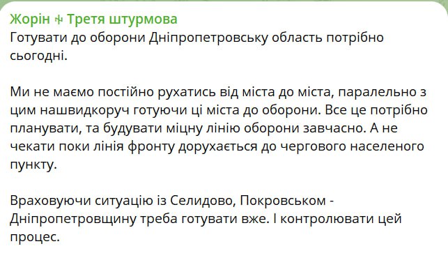 Заступник командира Третьої штурмової бригади ЗСУ Максим Жорін закликав готувати до оборони Дніпропетровську область.