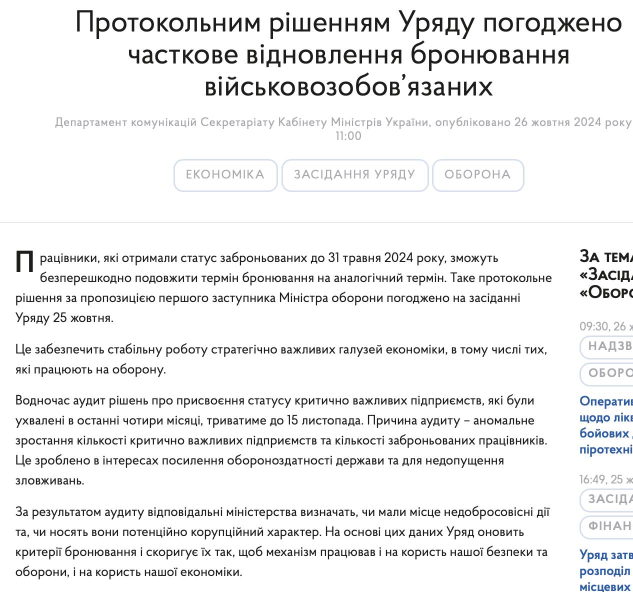 На підставі даних перевірки уряд оновить критерії бронювання, заявляє Кабмін.