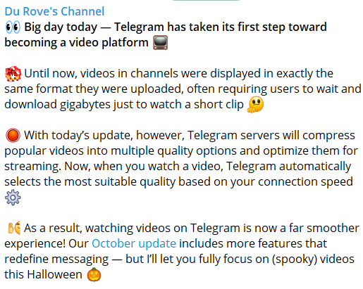 "Досі відео в каналах відображалися в тому ж форматі, в якому вони були завантажені, і користувачам часто доводилося чекати і завантажувати гігабайти, щоб подивитися короткий ролик. Однак із сьогоднішнім оновленням сервери Телеграма стискатимуть популярні відео в кілька варіантів якості та оптимізують їх Тепер, коли ви дивитеся відео, Телеграм автоматично вибирає найбільш підходящу якість в залежності від швидкості вашого з'єднання, - повідомив засновник месенджера, який зробив черговий крок на шляху до відеоплатформи.