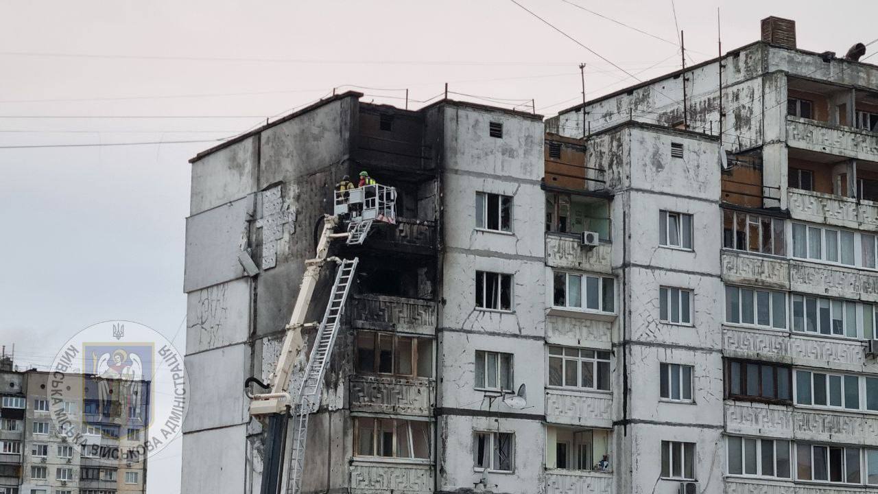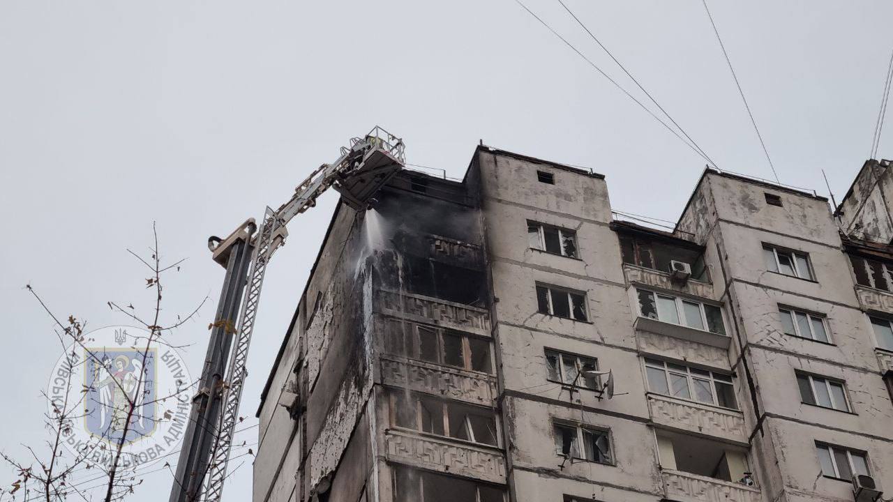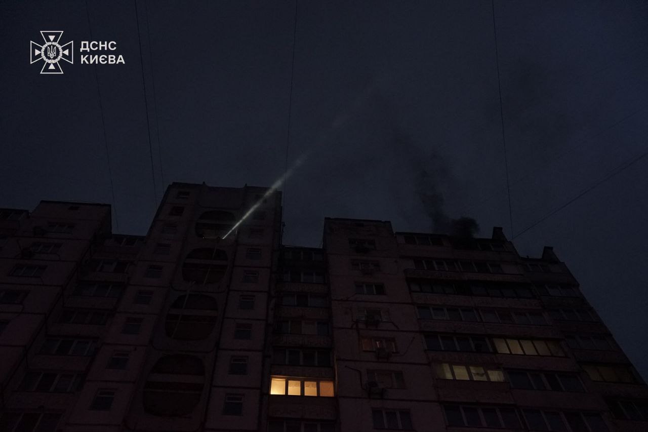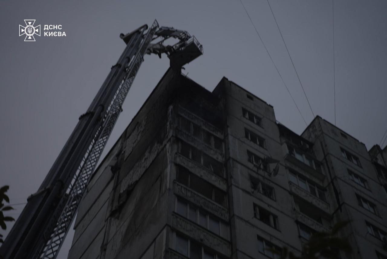 Внаслідок атаки БпЛА сталося займання та часткове руйнування у квартирах на 15 та 16 поверхах, 16-поверхового житлового будинку у Святошинському районі міста.