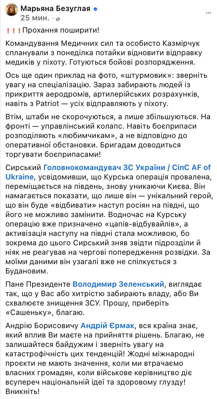 Також вона пише про те, що "зараз забирають людей із прикриття аеродромів, артилерійських розрахунків, навіть із Patriot – усіх відправляють у піхоту".