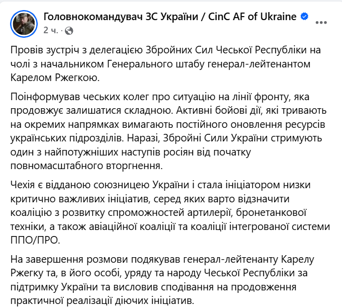 "Поінформував чеських колег про ситуацію на лінії фронту, яка продовжує залишатися складною. Активні бойові дії, що продовжуються в окремих напрямках, вимагають постійного оновлення ресурсів українських підрозділів", - написав Сирський.