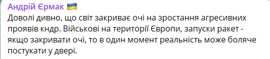 "Досить дивно, що світ заплющує очі на зростання агресивних проявів КНДР. Військові на території Європи, запуски ракет – якщо заплющувати очі, то одночасно реальність може боляче постукати у двері", - написав глава Офісу.