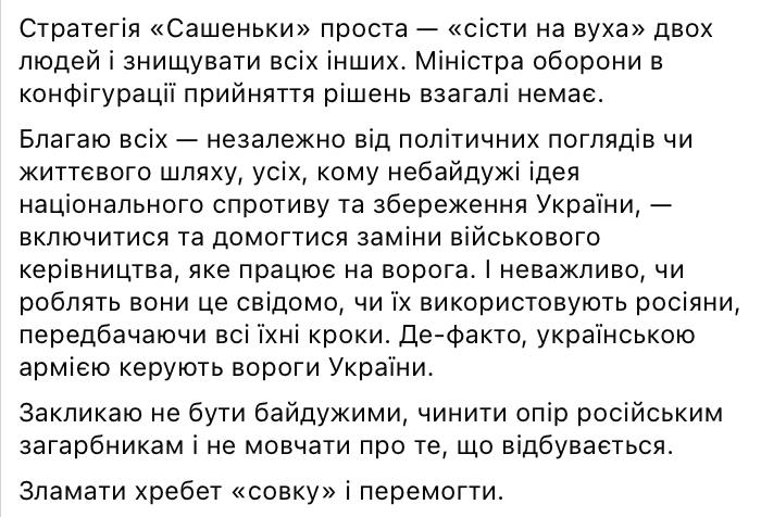 Також вона пише про те, що "зараз забирають людей із прикриття аеродромів, артилерійських розрахунків, навіть із Patriot - усіх відправляють у піхоту".