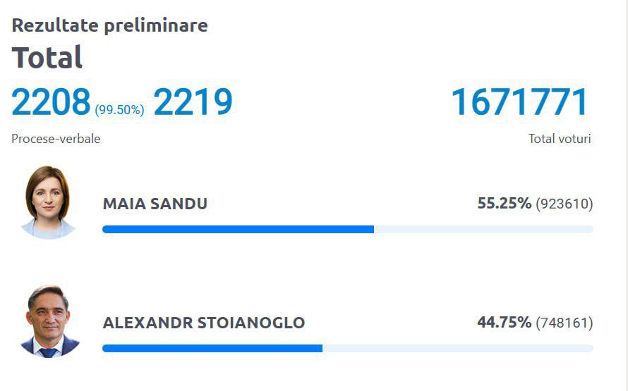 На виборах президента у Молдові, за даними підрахунку майже 100% голосів, перемагає Майя Санду.