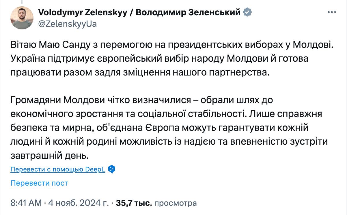 "Україна підтримує європейський вибір народу Молдови та готова працювати разом для зміцнення нашого партнерства", - написав президент України.