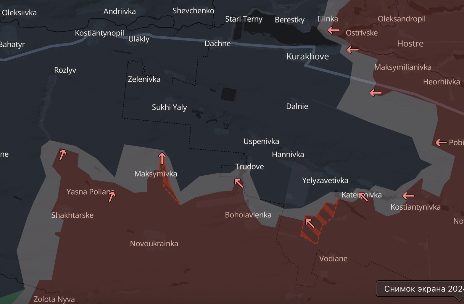 На південь від Курахового росіяни вже за вісім кілометрів від траси Запоріжжя-Курахове (тиждень тому було 11 кілометрів). За даними Deep State, вони просунулися у районі Максимівки.