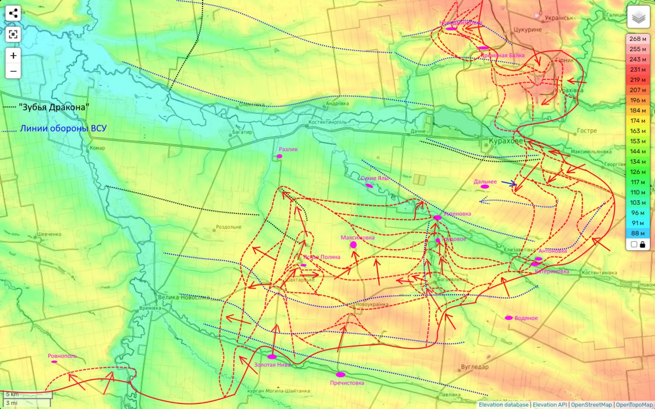 При цьому, як видно по його карті, бої підійшли до села Сонцівка, за добу фронт присунувся до села на два кілометри. Це важливий населений пункт, захоплення якого відкриває росіянам шлях до траси Запоріжжя-Курахове на захід від Курахівського водосховища.