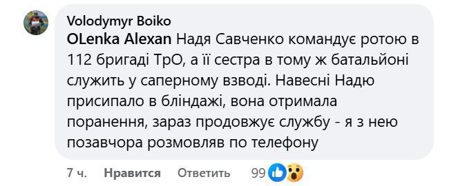"Надя Савченко командує ротою у 112-й бригаді ТРО, а її сестра в тому ж батальйоні служить у саперному взводі. Навесні Надю присипало у бліндажі, вона отримала поранення, зараз продовжує службу", – написав журналіст.