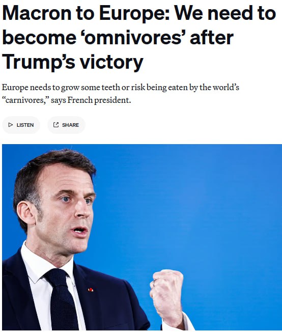 "Для мене все просто. Світ складається з травоїдних та м'ясоїдних. Якщо ми вирішимо залишитися травоїдними, то хижаки переможуть, а ми станемо для них ринком збуту", - сказав Макрон європейським лідерам під час зустрічі у Будапешті.