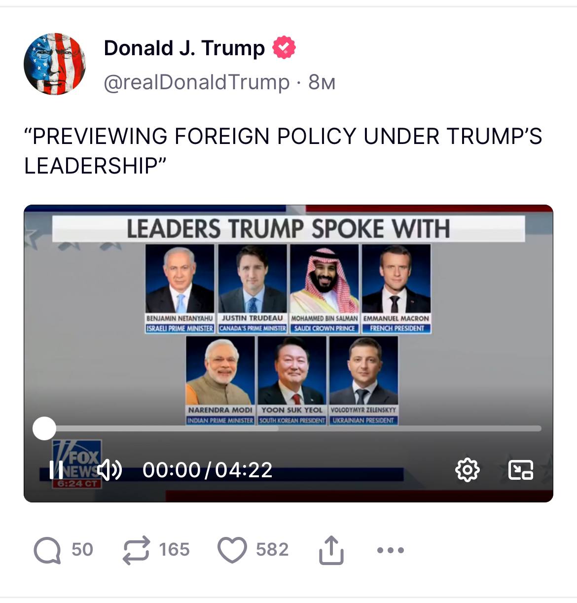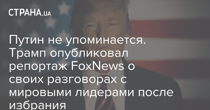 Дональд Трамп, який переміг на виборах президента США, розмістив у себе в мережі Truth Social сюжет FoxNews про свої розмови зі світовими лідерами, проведеними вже після обрання, в якому немає згадки про главу Кремля Володимира Путіна.