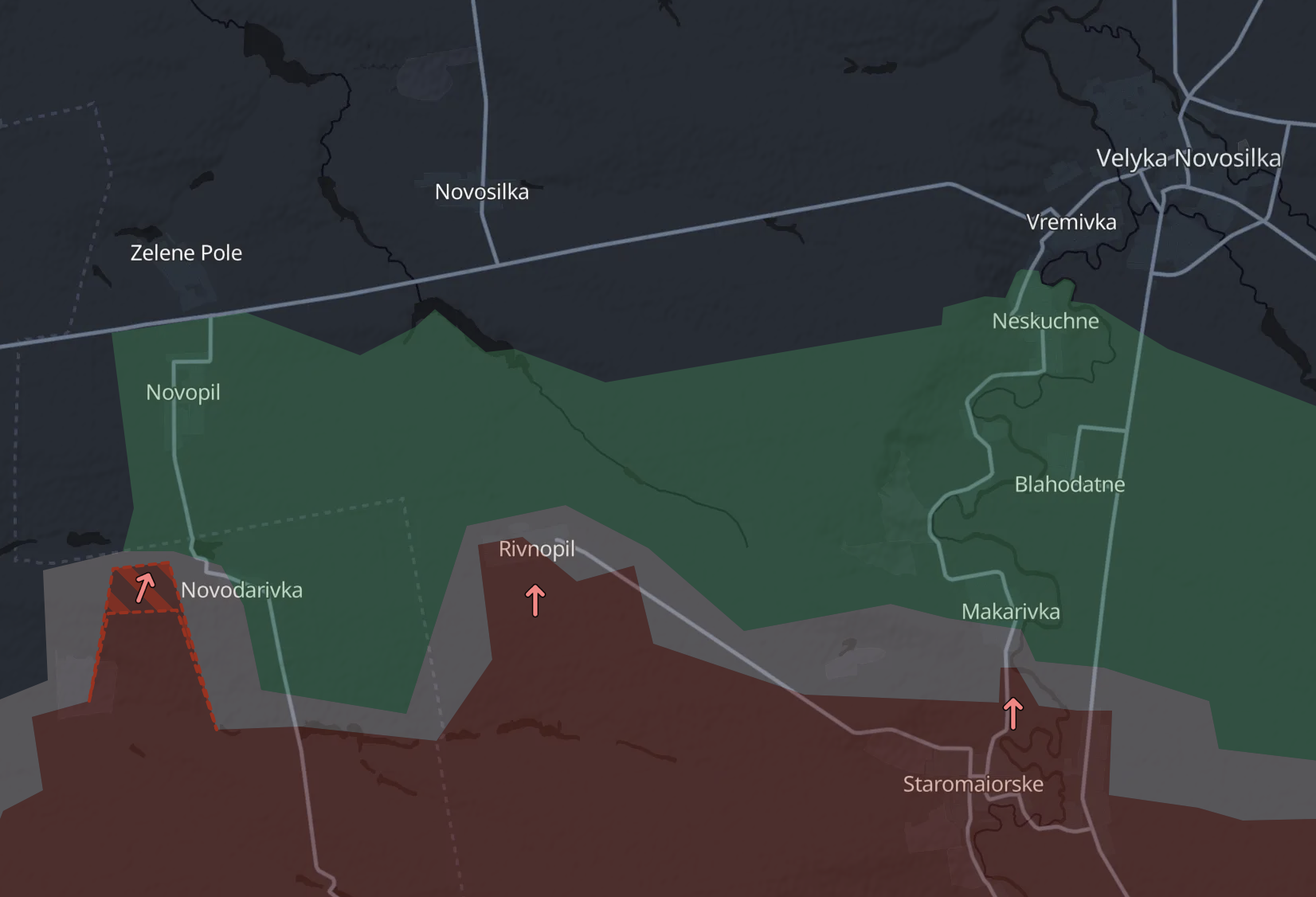 На півдні Донецької області, в районі Великої Новосілки, де днями активізувалися російські війська, вони просунулися на захід і на південь від Новодарівки. Також російська міноборона заявляє про захоплення сусіднього Рівного. Судячи з карти Deep State, його захоплено майже повністю.