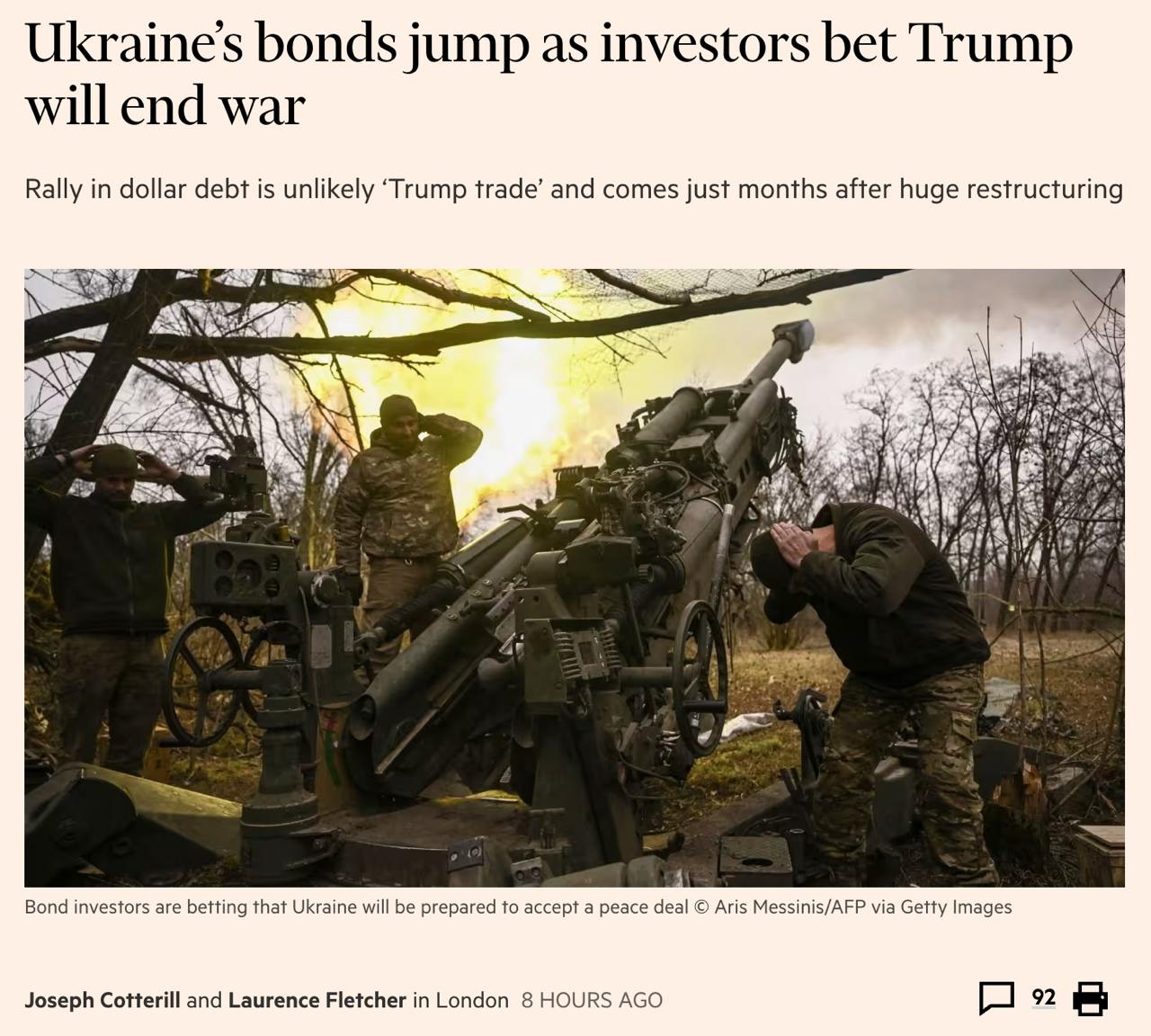 Доларові облігації України за місяць зросли на 12% на тлі очікувань інвесторів, що новообраний президент США Дональд Трамп закінчить війну.
