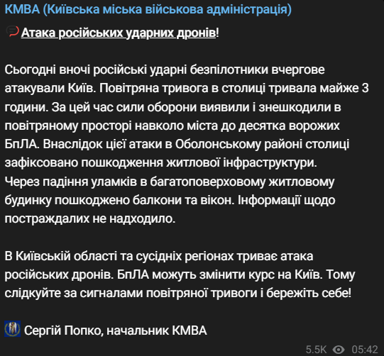 "За цей час сили оборони виявили та знешкодили у повітряному просторі навколо міста до десятка ворожих БПЛА. Внаслідок цієї атаки в Оболонському районі столиці зафіксовано пошкодження житлової інфраструктури", - повідомив начальник КДВА Сергій Попко.