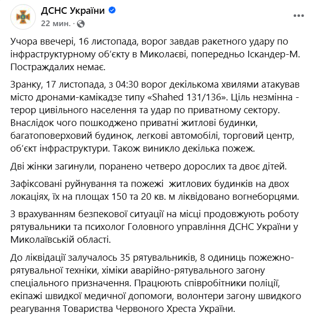 Сьогодні вранці росіяни кількома хвилями атакували Миколаїв дронами-камікадзе на кшталт "Shahed 131/136". Загинули дві жінки, ще шестеро людей поранено, серед них двоє дітей.