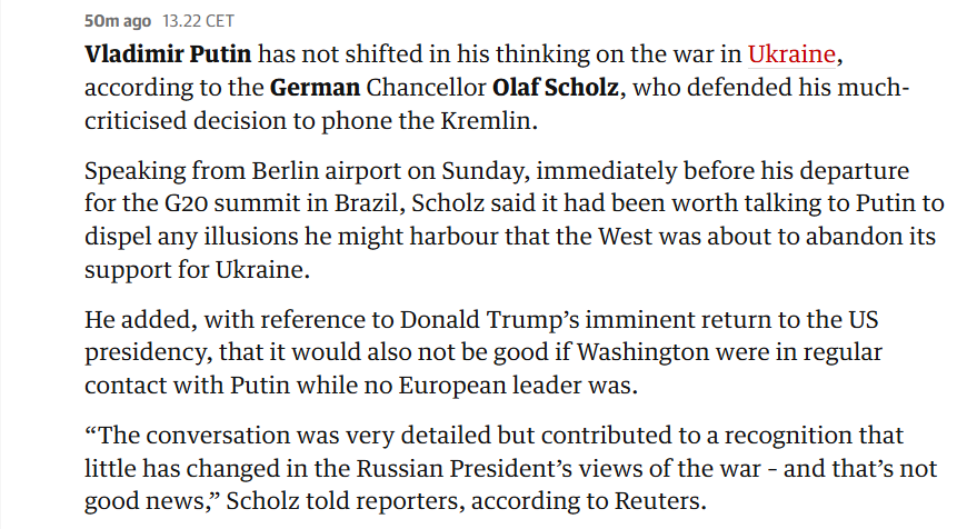 Виступаючи в неділю в аеропорту Берліна перед своїм від'їздом на саміт G20 до Бразилії, Шольц заявив, що варто поговорити з Путіним, щоб розвіяти будь-які ілюзії, які він міг плекати з приводу того, що Захід збирається відмовитися від підтримки України.
