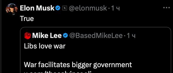 Він у соцмережі Х погодився з думкою, що "ліберали люблять війну", яка "сприяє зростанню масштабів державного управління".
