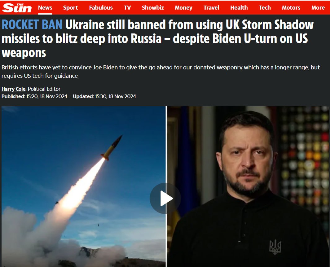 Видання зазначає, що США продовжують блокувати використання британських ракет, незважаючи на те, що дали добро на використання власних систем ATACMS для заподіяння обмежених ударів углиб території Росії.