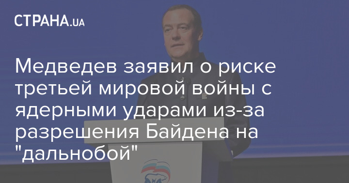 Заступник голови Ради безпеки Росії Дмітрій Медведєв заявив про ризик розв'язання третьої світової війни з обміном ядерними ударами та загибеллю "значної частини людства" через дозвіл Джо Байдена завдавати по Росії далекобійних ударів.