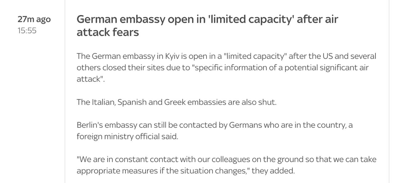 А посольство Німеччини у Києві відкрилося в "обмеженому режимі" через побоювання авіаударів, про що повідомляє Sky News.