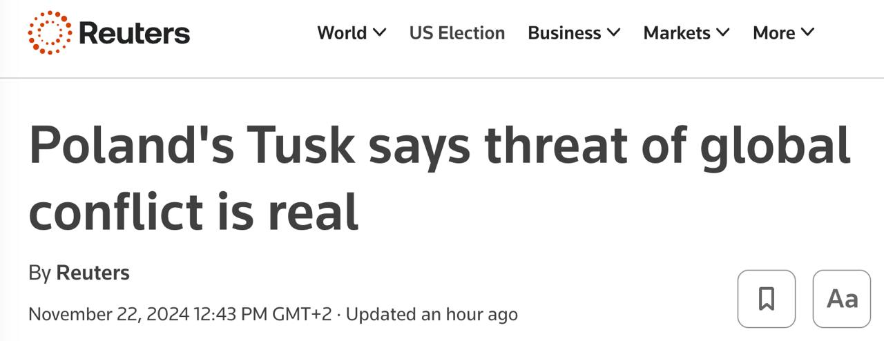 14:33 Прем'єр Польщі Дональд Туск заявив про "реальний ризик глобального конфлікту", передає Reuters.