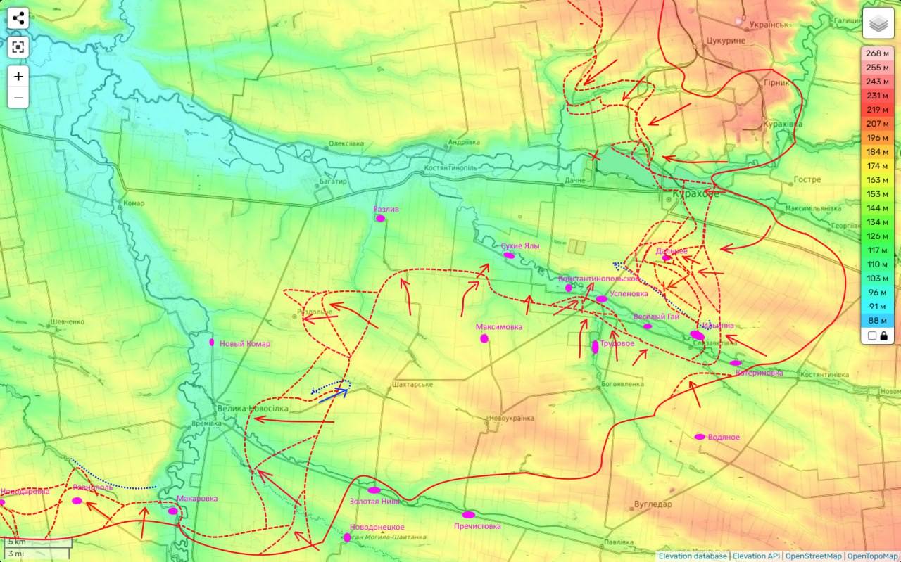 Центральною точкою фронту зараз залишається Курахове. За версією українських пабліків, бої точаться у східній половині міста. Російські паблики пишуть, що йдуть бої за висотну забудову міста, яка переважно під ЗСУ, як і західні околиці.