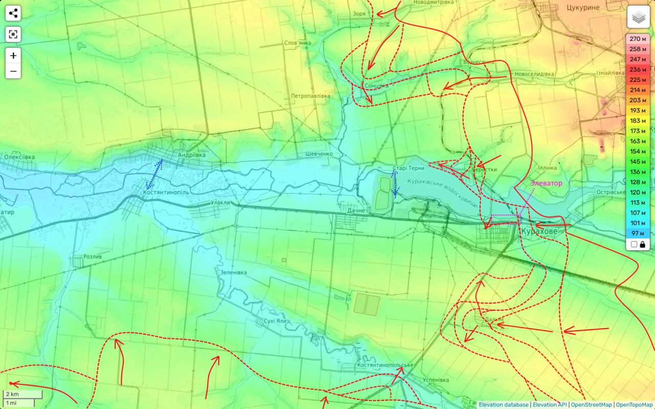 Також, за версією росіян, зі сходу бої підходять до села Старі Терни, що має ключове значення, на північний захід від Курахового і водосховища.