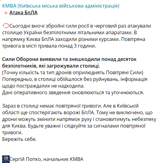 "Сили Оборони виявили і знешкодили більше десятка безпілотників, що погрожували столиці (Точну кількість і тип дронів оприлюднять Повітряні Сили). Попередньо в столиці обійшлося без руйнувань, інформація про постраждалих не надходила", - йдеться в повідомленні.