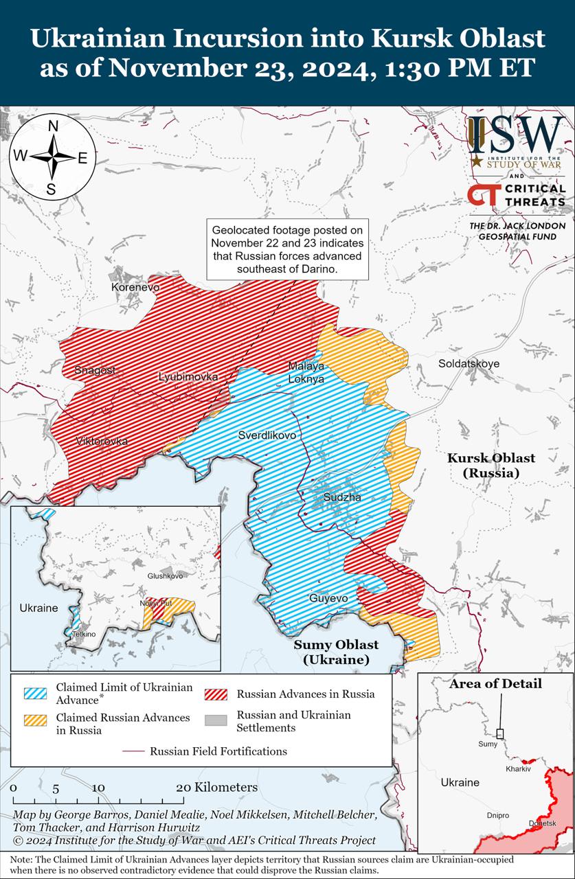 Американський Інститут вивчення війни публікує карту про зміну ситуації на фронті. Повідомляється, що російські війська мали певні успіхи у Курській області.