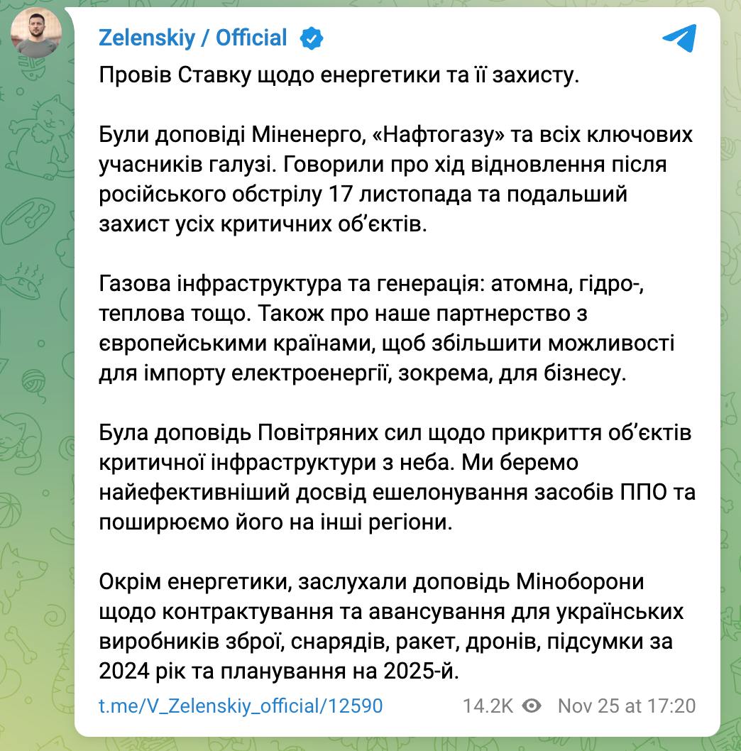 Президент України Володимир Зеленський повідомив, що провів Ставку верховного головнокомандувача з енергетики та її захисту.