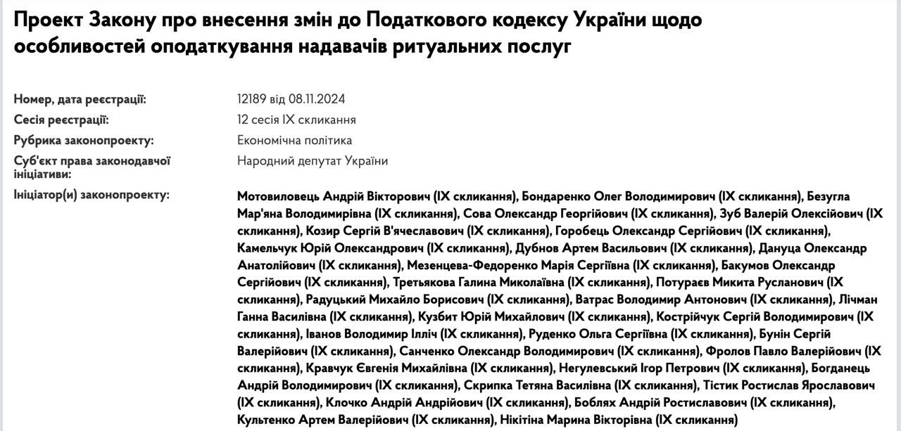 Проект закону №12189 за назвою "Про внесення змін до Податкового кодексу України щодо особливостей оподаткування надавачів ритуальних послуг" опубліковано на сайті парламенту.
