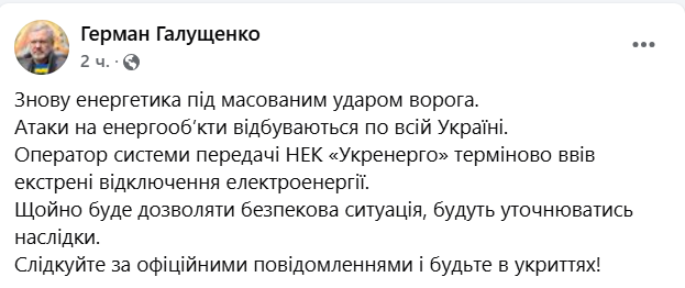 "Знову енергетика під масованим ударом ворога. Атаки на енергооб'єкти проходять по всій Україні.