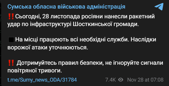 Також російські війська завдали ракетного удару по інфраструктурі Шосткінської громади на Сумщині, повідомляє ОВА. Зафіксовано 3 вибухи.