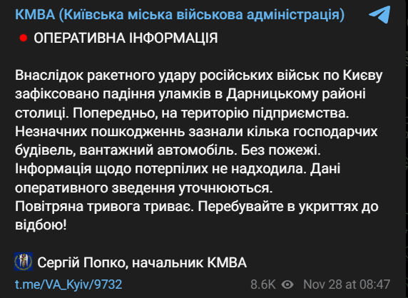 У Києві внаслідок ракетного удару РФ зафіксовано падіння уламків у Дарницькому районі столиці. Про це повідомляє КМВА.
