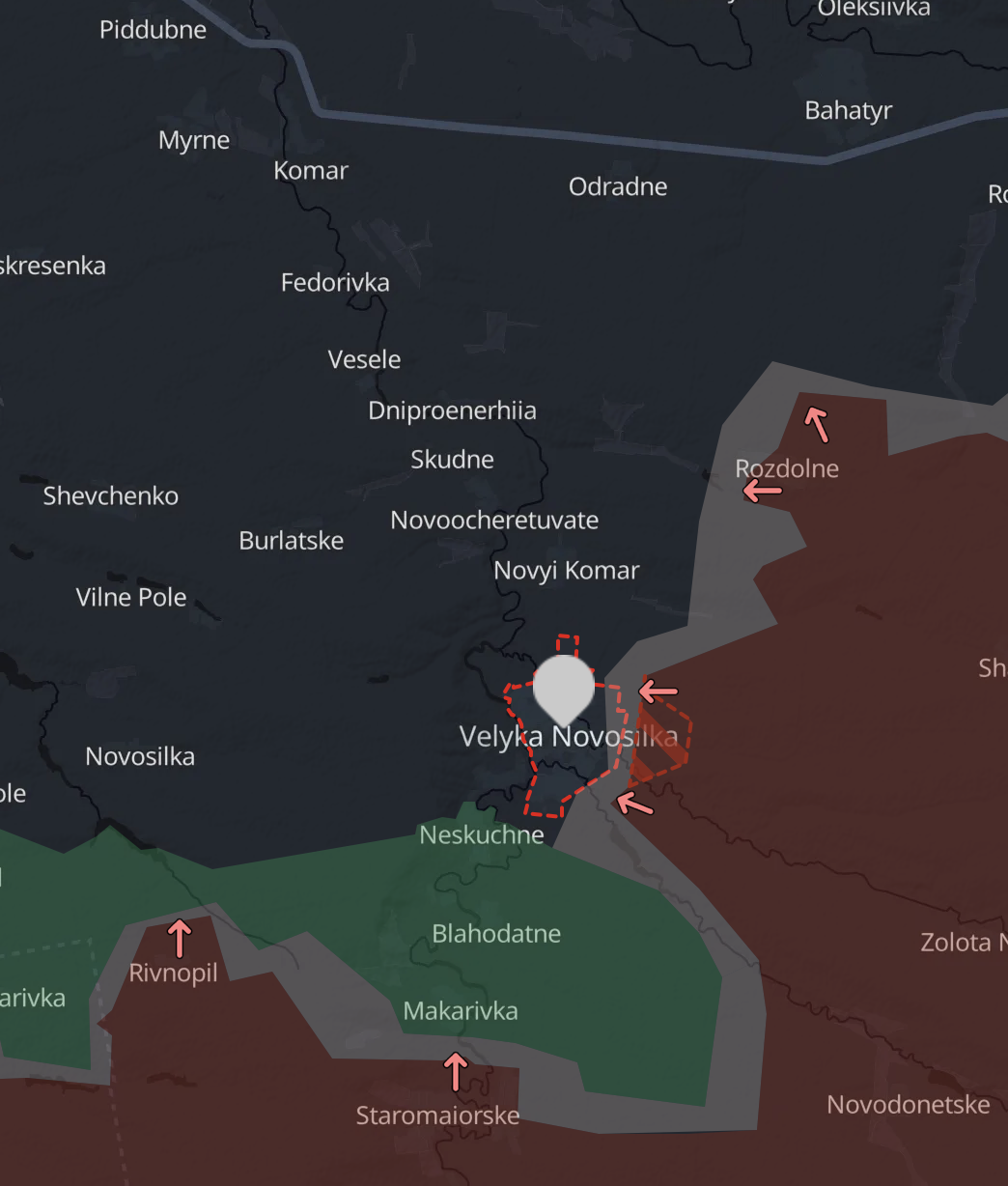 Західні росіяни також просунулися на схід від Великої Новосілки Донецької області. При цьому українські військові пишуть, що основні зусилля докладає РФ для обходу міста. Офіцер ЗСУ з позивним "Алекс" пише, що росіяни "підтискають" з боку Рівного та Роздольного. Російське міноборони заявило, що Роздольне вже захоплено.
