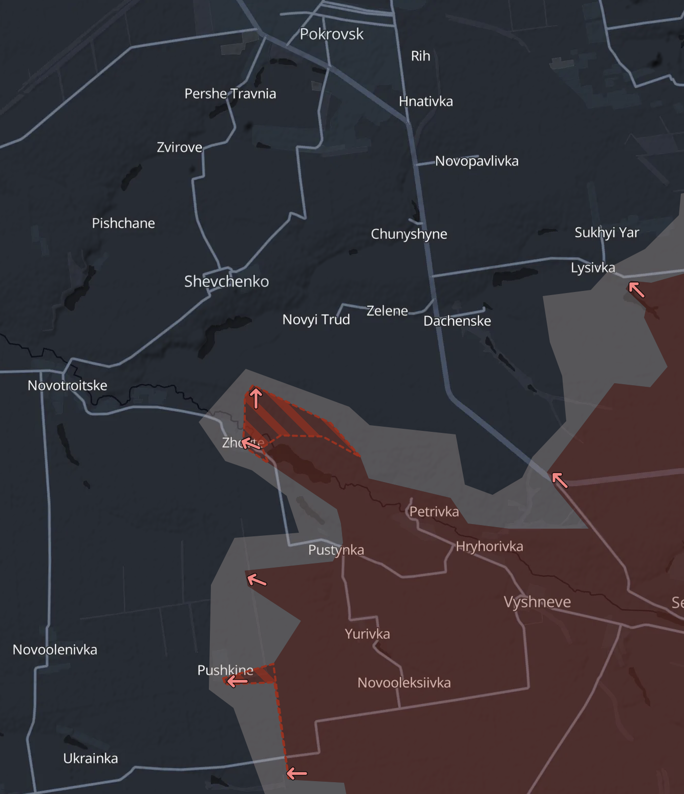 Також російські війська продовжують просуватися на південь від Покровська. Так вони наступають з боку Жовтого, яке було нещодавно захоплене, і ведуть бої у Пушкіно.