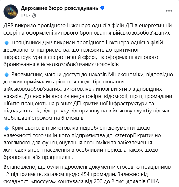 За даними слідства, провідний інженер підприємства виготовляв липові витяги з наказів Мінекономіки про бронювання, куди вносив недостовірні відомості про працевлаштування громадян на держпідприємства критичної інфраструктури та отримання відстрочок.