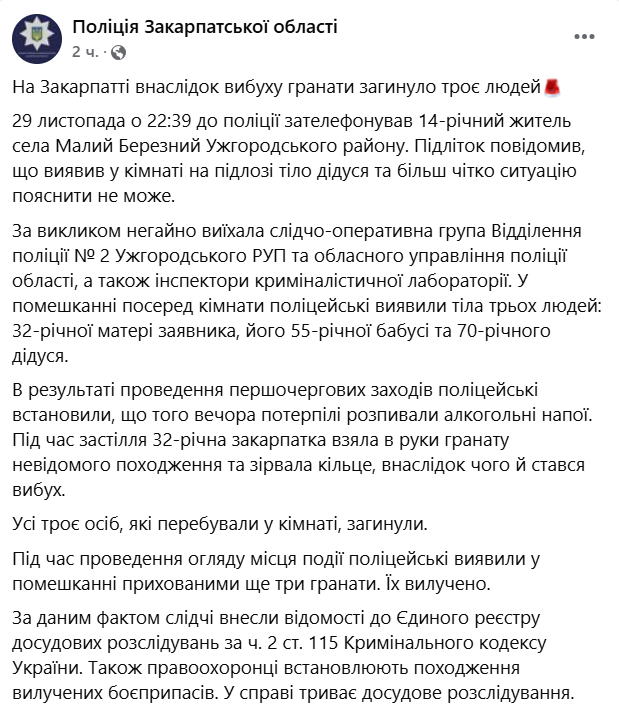 У Закарпатській області внаслідок вибуху гранати загинули троє людей. Про інцидент повідомив 14-річний юнак, загинула його 32-річна мати, 55-річна бабуся та 70-річний дідусь.